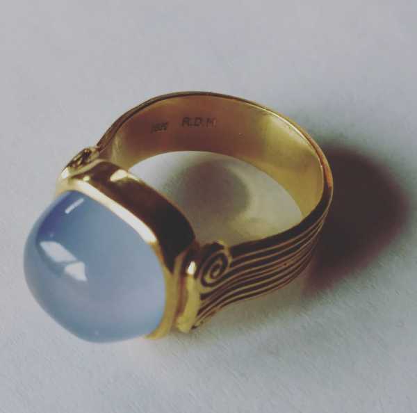 This ring, designed and made by Rick Hamilton, was created using several techniques. The gem was hand cut by Joe Jelks from blue chalcedony rough. The bezel was fabricated from 18k yellow gold flat wire stock. The ring shank was designed in ArtCAM, cut in wax on a milling machine, and then cast in…